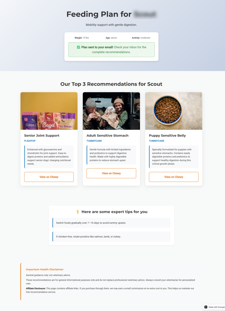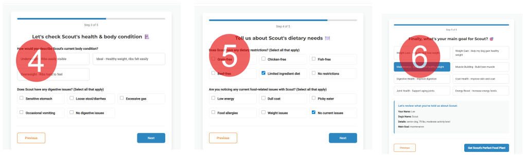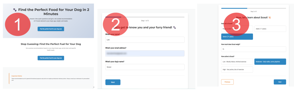 Prospect fills out a quiz related to the niche--This is completely customizable by you--For vets, for instance, we like to send people through a quiz related to pet food (in this case, dog food)
